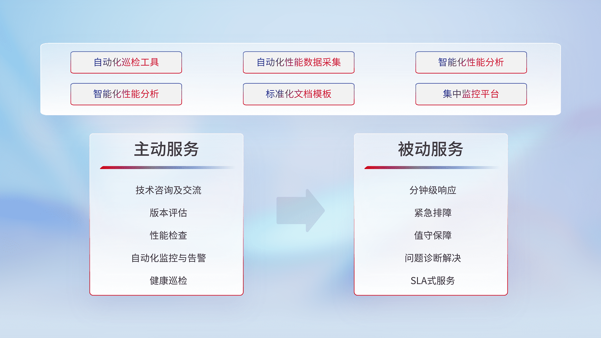 智能化工具和标准化文档,,,保障服务质量,,提供主动服务(包含技术咨询、、版本评估、、、性能检查、、、、自动化监控与告警、、、健康巡检)和被动服务包含(分钟级响应、、、、紧急排障、、、、值守保障、、、问题诊断解决、、SLA服务)。。。